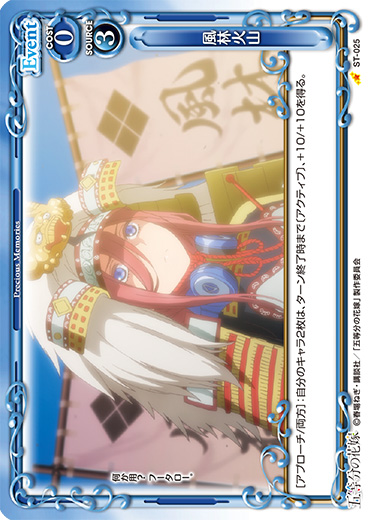 | [メイン/自分]:《休》自分のキャラ1枚は、ターン終了時まで+30/+30を得る。(《休》:このキャラを休息状態にすることでテキストを使用できる。) | ||