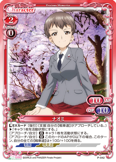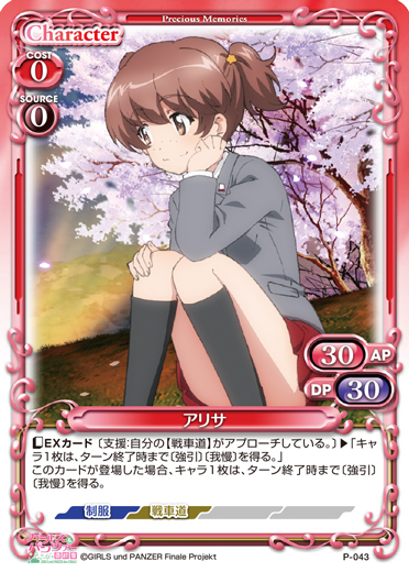 | 〔EXカード〕〔強引〕〔支援:自分の【戦車道】がアプローチしている。〕▸「キャラ1枚を活動状態にする。」[アプローチ/自分]:《0》キャラ1枚を活動状態にする。[アプローチ/自分]:《0》このカードのAPが0以下の場合、このターン、自分の全ての【戦車道】は+100/+100を得る。 | ||