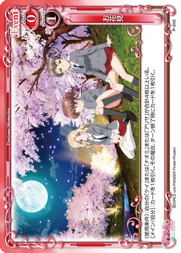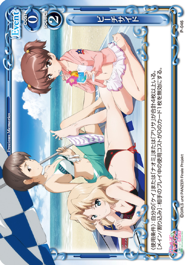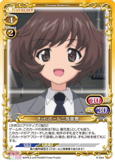 | 〔天然3〕〔アクティブ〕〔強引〕ゲーム中、このカードの名称は「秋山 優花里」としても扱う。このカードがアプローチした場合、相手の手札全てを表にする。このカードがアプローチで退場した場合、相手は、手札3枚を捨て札にする。 | ||