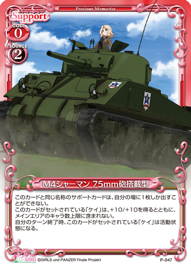 | 〔EXカード〕〔支援:自分の【戦車道】がアプローチしている。〕▸「キャラ1枚は、ターン終了時まで〔強引〕〔我慢〕を得る。」このカードが登場した場合、キャラ1枚は、ターン終了時まで〔強引〕〔我慢〕を得る。 | ||