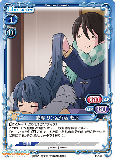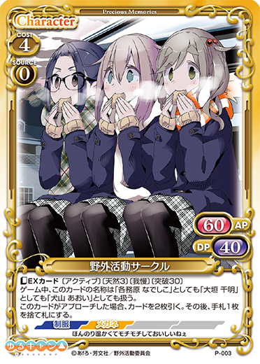 | 〔EXカード〕〔アクティブ〕〔天然3〕〔我慢〕〔突破30〕ゲーム中、このカードの名称は「各務原 なでしこ」としても「大垣 千明」としても「犬山 あおい」としても扱う。このカードがアプローチした場合、カードを2枚引く。その後、手札1枚を捨て札にする。 | ||