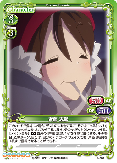 | このカードが登場した場合、EXデッキから『ゆるキャン△』のキャラを2枚まで抜き出し、手札に移す。[メイン/相手]:《0》自分のキャラ2枚を活動状態にする。その場合、このカードを捨て札にする。 | ||