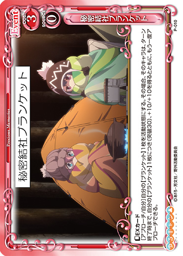 | 〔EXカード〕[アプローチ/自分]:自分の【ブランケット】1枚を活動状態にする。その場合、そのキャラは、ターン終了時まで、自分の【ブランケット】1枚につき〔突破30〕、+10/+10を得るとともに、もう一度アプローチできる。 | ||