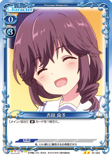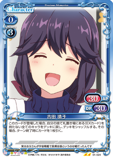 | ゲーム中、このカードの名称は「吉田 優子」としても扱う。このカードは、キャラの効果の対象にならない。このカードは、このカードよりAPが高いキャラには妨害されない。 | ||