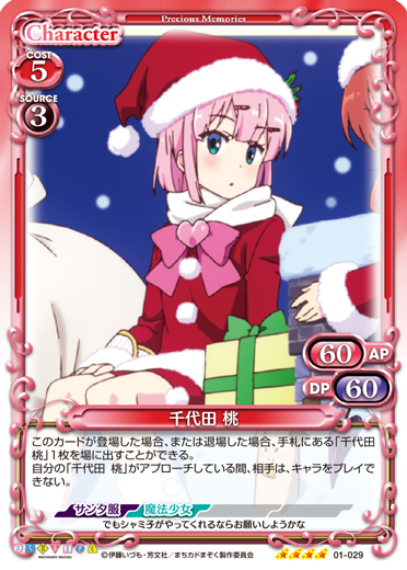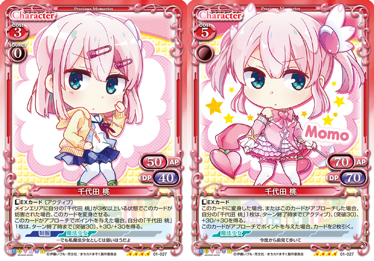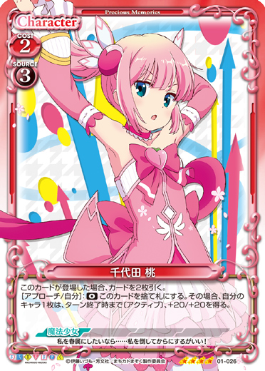 | このカードが登場した場合、または退場した場合、手札にある「千代田 桃」1枚を場に出すことができる。自分の「千代田 桃」がアプローチしている間、相手は、キャラをプレイできない。 | ||