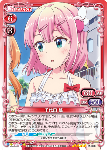 | このカードは、メインエリアに自分の「千代田 桃」が4枚以上いる場合、〔突破30〕、+20/+20を得る。このカードが登場した場合、メインエリアにいる使用コストが3以下の相手のキャラ1枚を指定する。その場合、このカードと指定したキャラは退場判定を行うことができる。 | ||