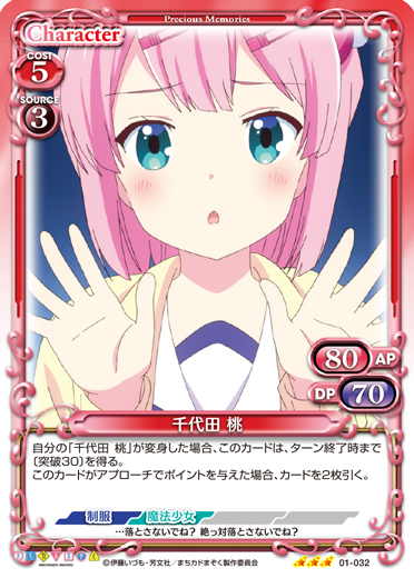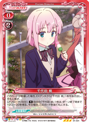 | このカードが登場した場合、EXデッキから「千代田 桃」1枚を抜き出し、手札に移す。[アプローチ/自分]:《1》自分の「千代田 桃」1枚は、ターン終了時まで+20/+20を得る。その場合、このカードを捨て札にする。 | ||