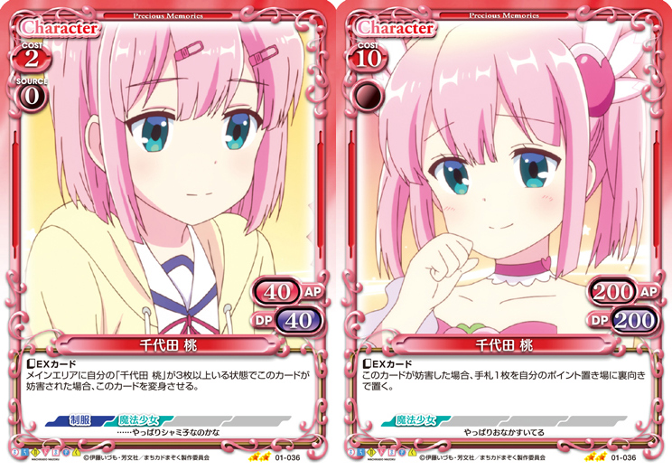 | 〔EXカード〕メインエリアに自分の「千代田 桃」が3枚以上いる状態でこのカードが妨害された場合、このカードを変身させる。 | ||