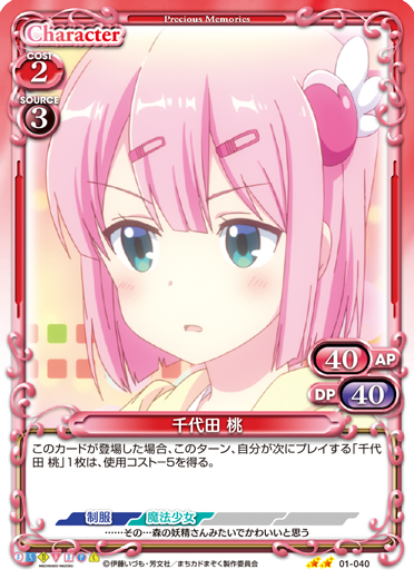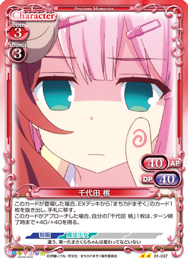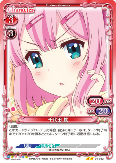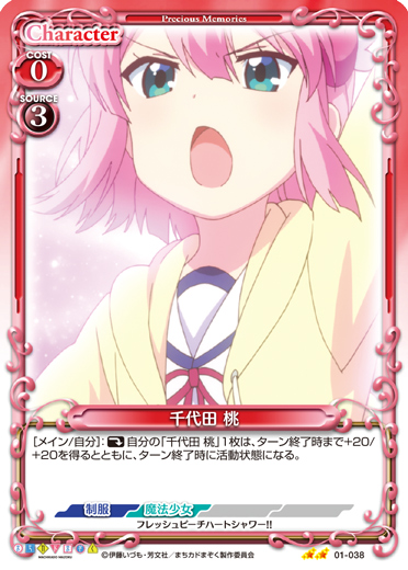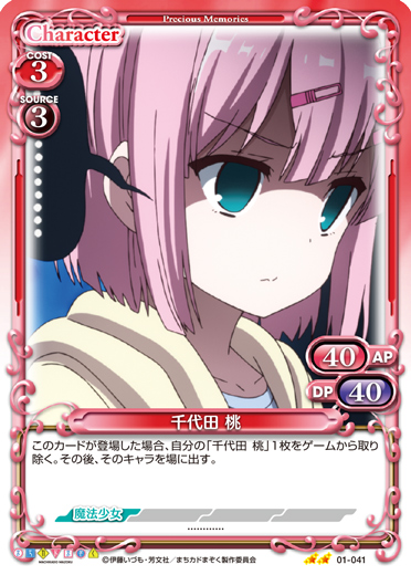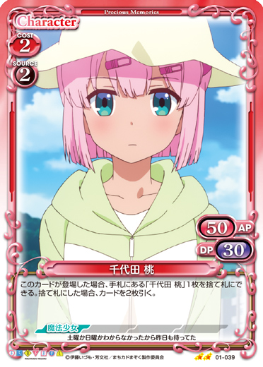 | このカードが登場した場合、このターン、自分が次にプレイする「千代田 桃」1枚は、使用コスト-5を得る。 | ||