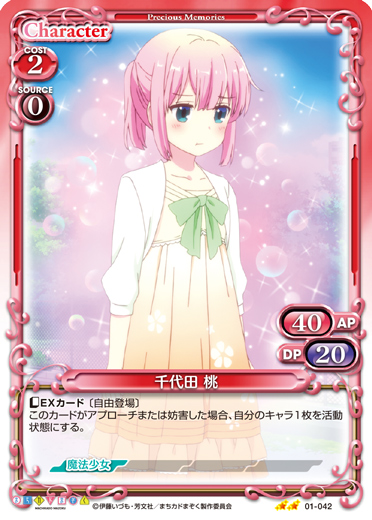 | このカードが登場した場合、EXデッキから『まちカドまぞく』のカード1枚を抜き出し、手札に移す。このカードがアプローチした場合、自分の「千代田 桃」1枚は、ターン終了時まで+40/+40を得る。 | ||