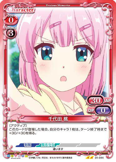 | このカードが登場した場合、カードを1枚引くことができる。カードを引いた場合、手札1枚を捨て札にする。[メイン/自分]:《休》自分の「千代田 桃」1枚は、ターン終了時まで+30/+30を得る。 | ||