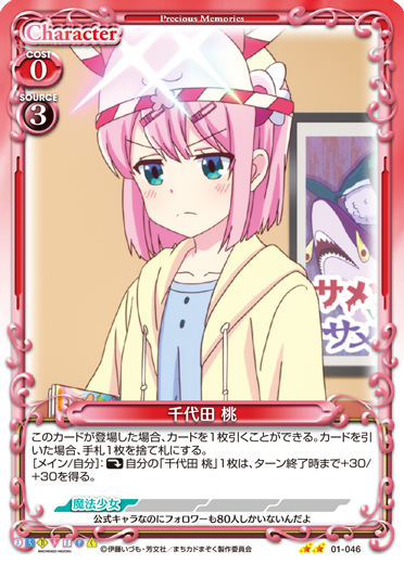 | このカードが登場した場合、デッキの上のカード7枚を見て、その中にある「千代田 桃」または「変身卍句」1枚を抜き出し、表にしてから手札に移す。その後、デッキをシャッフルする。 | ||