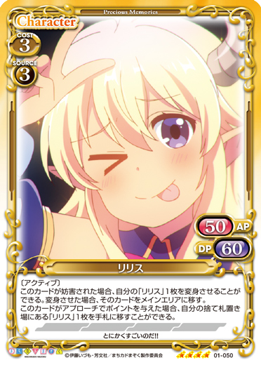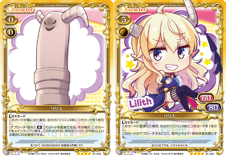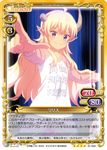 | 〔EXカード〕このカードに変身した場合、自分の「リリス」4枚につきカードを1枚引く。このカードがアプローチするごとに、相手のキャラ1枚を休息状態にする。 | ||