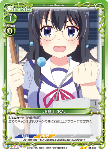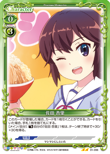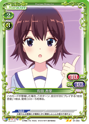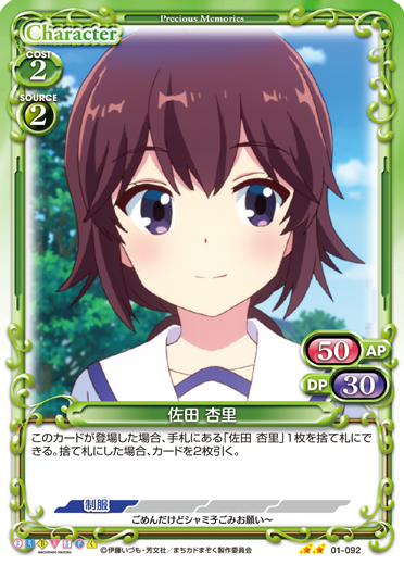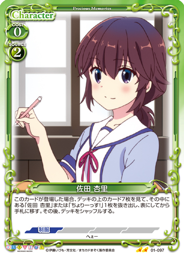 | このカードが登場した場合、このターン、自分が次にプレイする「佐田 杏里」1枚は、使用コスト-5を得る。 | ||