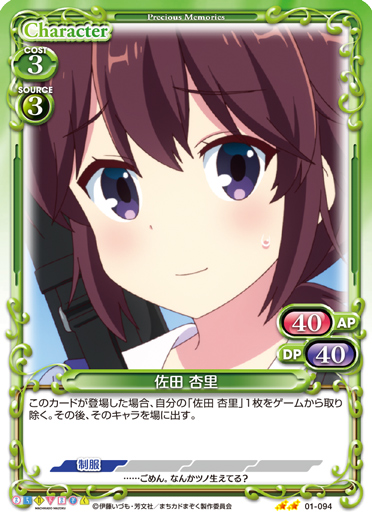 | このカードが登場した場合、自分の「佐田 杏里」1枚をゲームから取り除く。その後、そのキャラを場に出す。 | ||