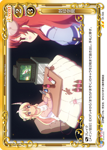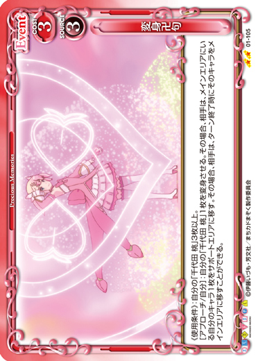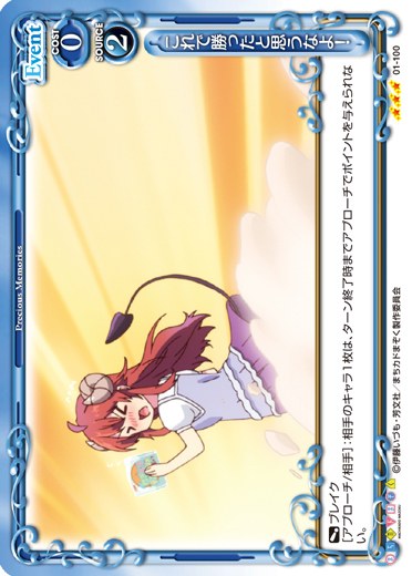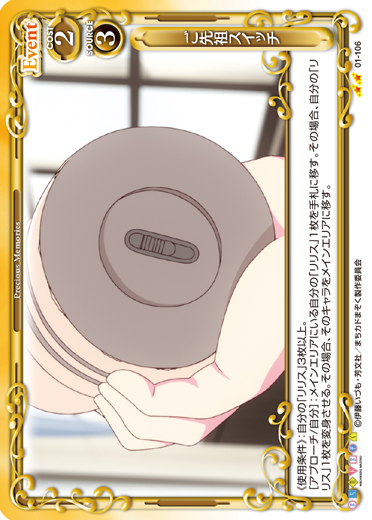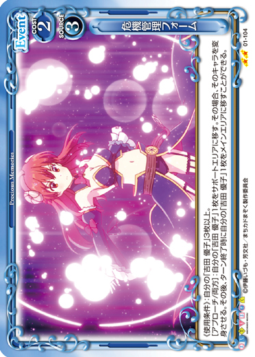 | 《使用条件》:自分の「千代田 桃」3枚以上。[アプローチ/自分]:自分の「千代田 桃」1枚を変身させる。その場合、相手は、メインエリアにいる自分のキャラ1枚をサポートエリアに移す。その場合、相手は、ターン終了時にそのキャラをメインエリアに移すことができる。 | ||