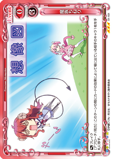 | 《使用条件》:自分の「リリス」3枚以上。[アプローチ/自分]:メインエリアにいる自分の「リリス」1枚を手札に移す。その場合、自分の「リリス」1枚を変身させる。その場合、そのキャラをメインエリアに移す。 | ||
