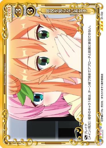 | 〔ブレイク〕[メイン/両方]:相手のキャラ1枚は、ターン終了時までアプローチと妨害に参加できない。 | ||