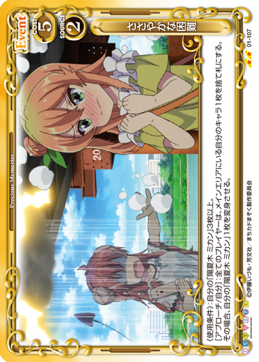 | 《使用条件》:自分の「陽夏木 ミカン」3枚以上。[アプローチ/自分]:全てのプレイヤーは、メインエリアにいる自分のキャラ1枚を捨て札にする。その場合、自分の「陽夏木 ミカン」1枚を変身させる。 | ||