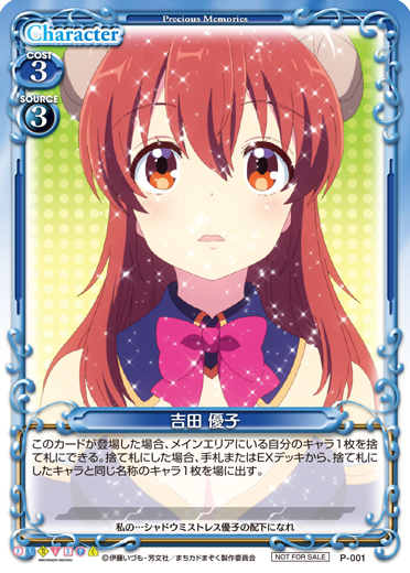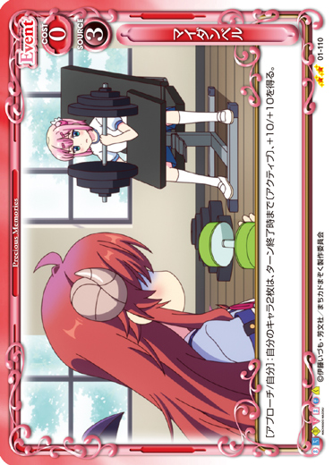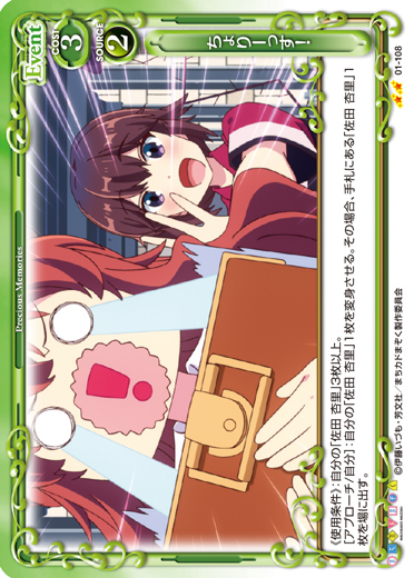 | 《使用条件》:自分の「佐田 杏里」3枚以上。[アプローチ/自分]:自分の「佐田 杏里」1枚を変身させる。その場合、手札にある「佐田 杏里」1枚を場に出す。 | ||