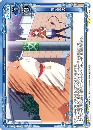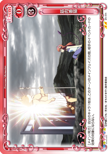 | このカードをプレイする場合、以下から1つ選択する。 ・[メイン/割り込み]:相手のプレイ中のイベントカード1枚を無効にする。 ・[アプローチ/割り込み]:相手のプレイ中のイベントカード1枚を無効にする。 | ||