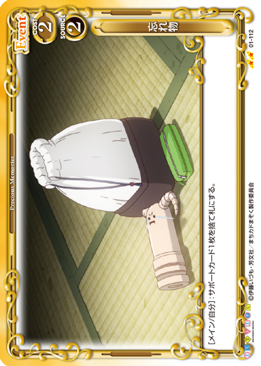 | [メイン/両方]:自分のキャラ1枚は、このターンのメインフェイズの間、相手のイベントカードの効果の対象にならない。 | ||
