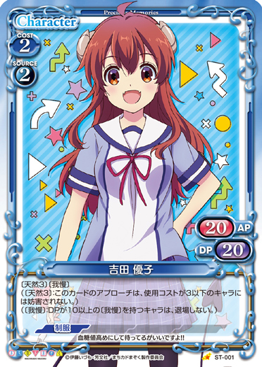 | 〔天然3〕〔我慢〕(〔天然3〕:このカードのアプローチは、使用コストが3以下のキャラには妨害されない。)(〔我慢〕:DPが10以上の〔我慢〕を持つキャラは、退場しない。) | ||