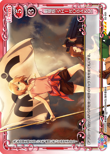 | [アプローチ/自分]:AP/DPを持つ相手のキャラ1枚を捨て札にする。 | ||