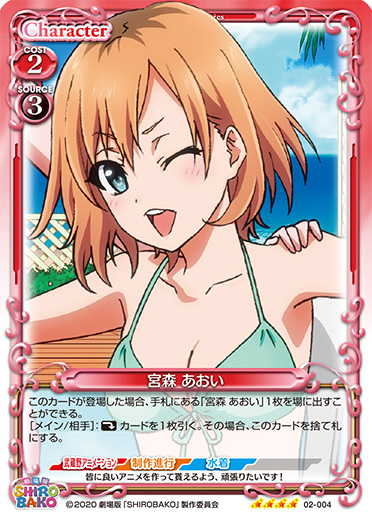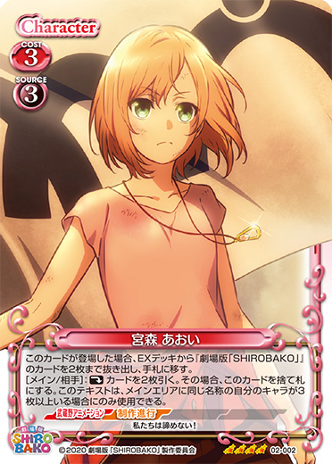| このカードが登場した場合、手札にある「宮森 あおい」1枚を場に出すことができる。[メイン/相手]:《休》カードを1枚引く。その場合、このカードを捨て札にする。 | ||