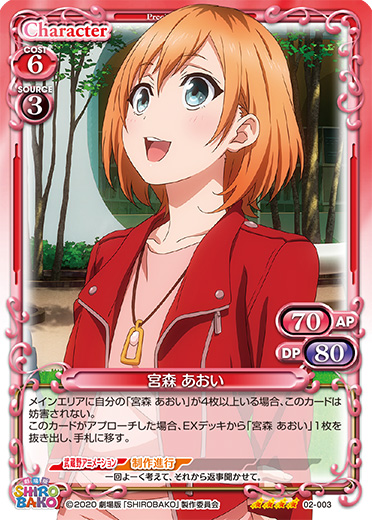 | メインエリアに自分の「宮森 あおい」が4枚以上いる場合、このカードは妨害されない。このカードがアプローチした場合、EXデッキから「宮森 あおい」1枚を抜き出し、手札に移す。 | ||