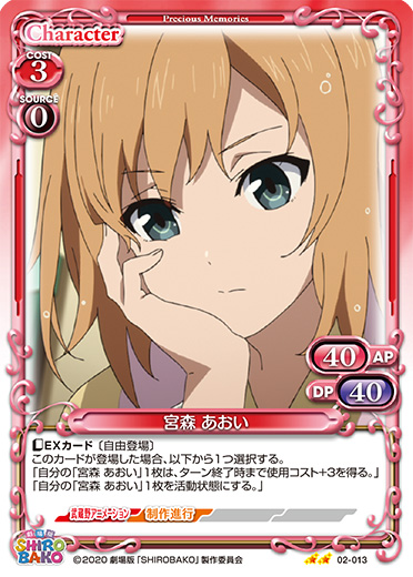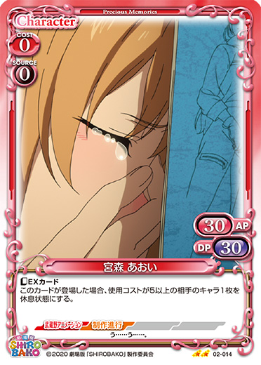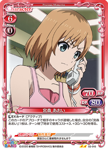 | 〔EXカード〕〔アクティブ〕このカードのアプローチで相手のキャラが退場した場合、自分の「宮森 あおい」1枚は、ターン終了時まで使用コスト+3、+30/+30を得る。 | ||