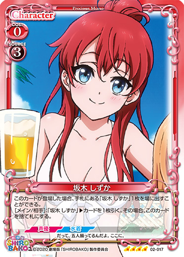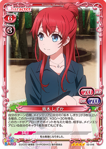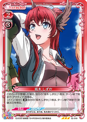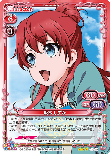| このカードが登場した場合、自分の「坂木 しずか」1枚は、ターン終了時まで〔アクティブ〕を得る。[メイン/自分]:《3》自分の「坂木 しずか」1枚は、ターン終了時まで〔突破30〕を得る。 | ||