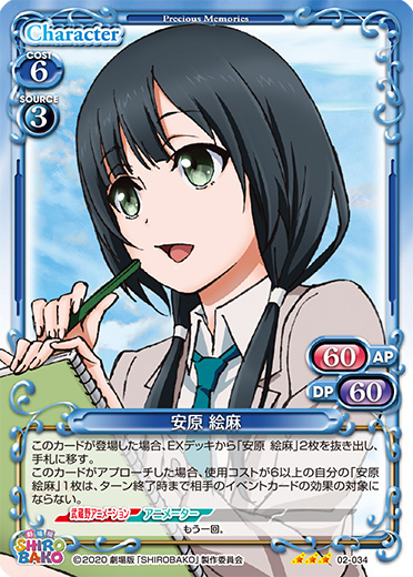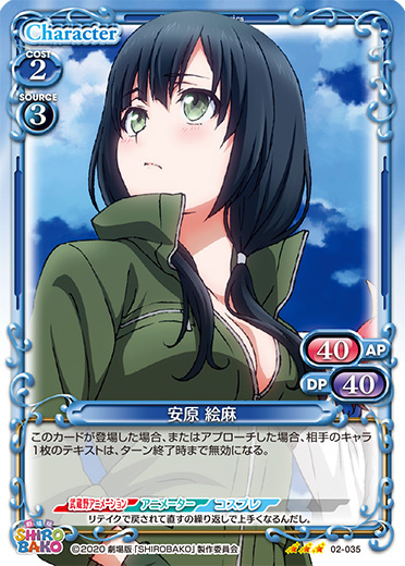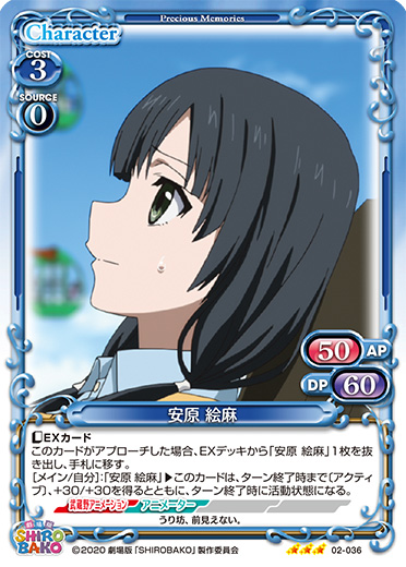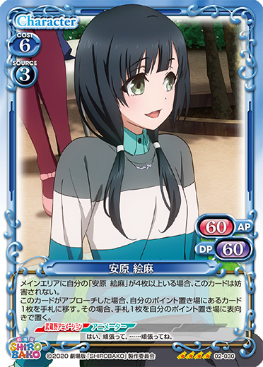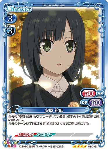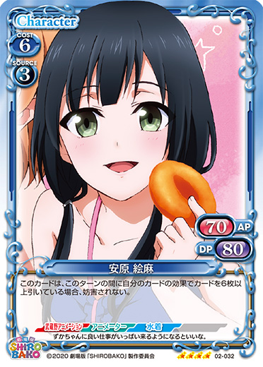 | 自分の「安原 絵麻」がアプローチしている間、相手のキャラは活動状態にならない。自分のターン終了時に「安原 絵麻」を2枚まで活動状態にする。 | ||