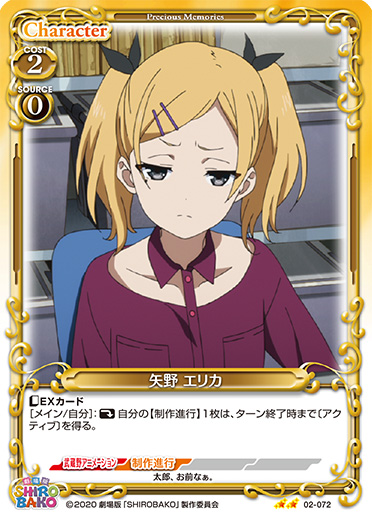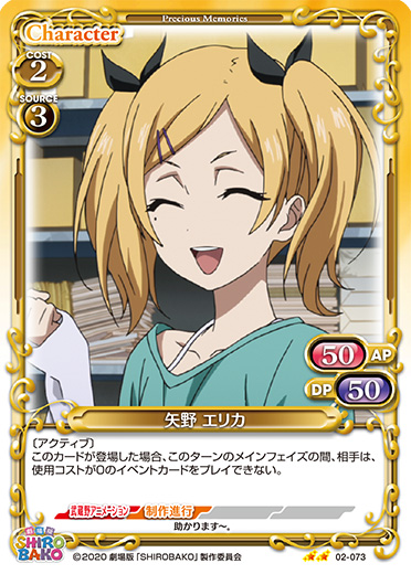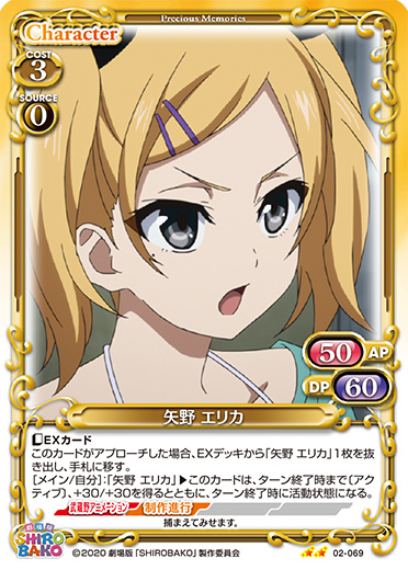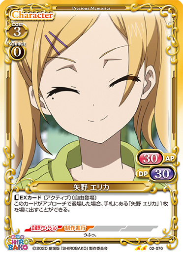 | 〔EXカード〕このカードがアプローチした場合、EXデッキから「矢野 エリカ」1枚を抜き出し、手札に移す。[メイン/自分]:「矢野 エリカ」▶このカードは、ターン終了時まで〔アクティブ〕、+30/+30を得るとともに、ターン終了時に活動状態になる。 | ||