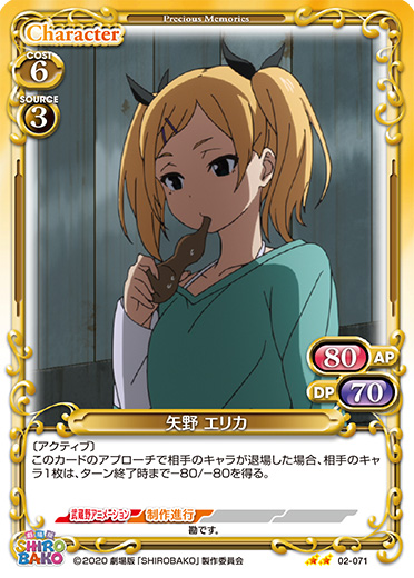 | 〔EXカード〕〔アクティブ〕〔自由登場〕このカードがアプローチで退場した場合、手札にある「矢野 エリカ」1枚を場に出すことができる。 | ||
