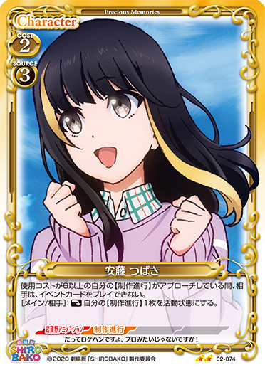 | 使用コストが6以上の自分の【制作進行】がアプローチしている間、相手は、イベントカードをプレイできない。[メイン/相手]:《休》自分の【制作進行】1枚を活動状態にする。 | ||
