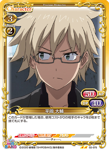 | 〔アクティブ〕このカードのアプローチで相手のキャラが退場した場合、相手のキャラ1枚は、ターン終了時まで-80/-80を得る。 | ||