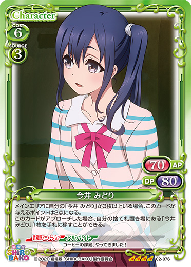 | メインエリアに自分の「今井 みどり」が3枚以上いる場合、このカードが与えるポイントは2点になる。このカードがアプローチした場合、自分の捨て札置き場にある「今井 みどり」1枚を手札に移すことができる。 | ||