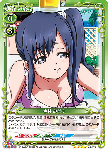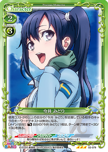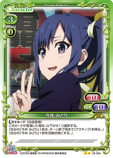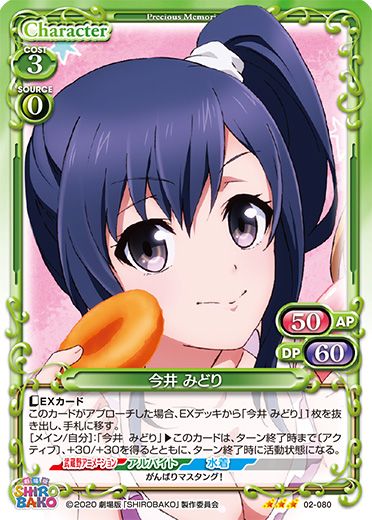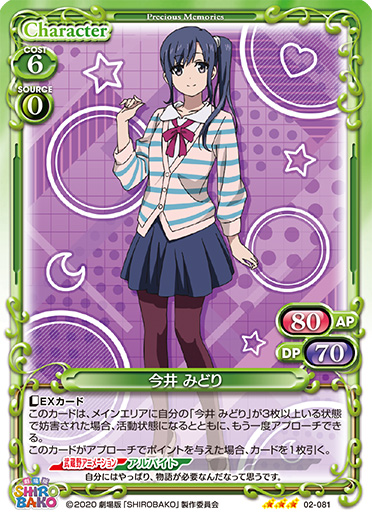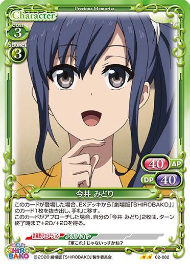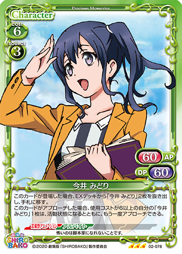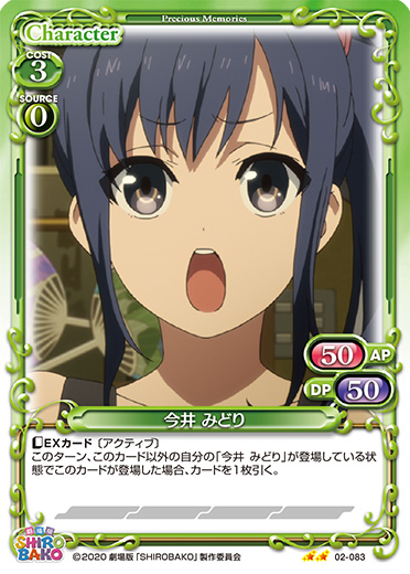 | このカードが登場した場合、EXデッキから『劇場版「SHIROBAKO」』のカード1枚を抜き出し、手札に移す。このカードがアプローチした場合、自分の「今井 みどり」2枚は、ターン終了時まで+20/+20を得る。 | ||