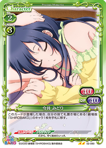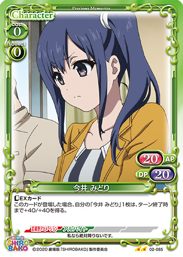 | 〔EXカード〕このカードが登場した場合、自分の「今井 みどり」1枚は、ターン終了時まで+40/+40を得る。 | ||