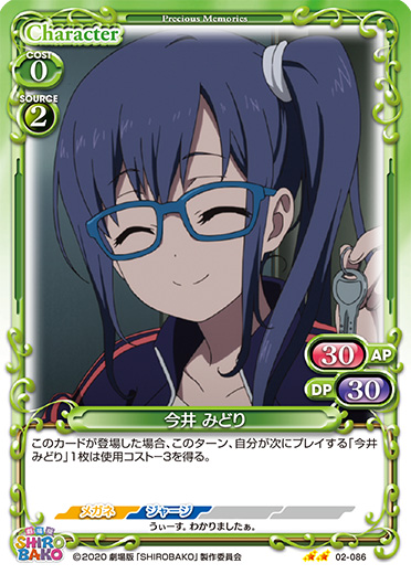 | このカードが登場した場合、このターン、自分が次にプレイする「今井 みどり」1枚は使用コスト-3を得る。 | ||