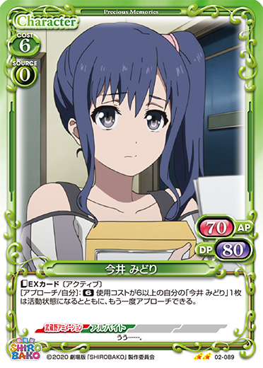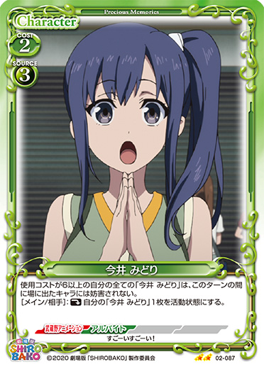 | 使用コストが6以上の自分の全ての「今井 みどり」は、このターンの間に場に出たキャラには妨害されない。[メイン/相手]:《休》自分の「今井 みどり」1枚を活動状態にする。 | ||