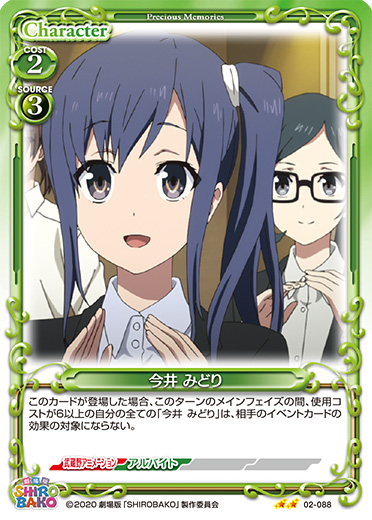 | このカードが登場した場合、このターンのメインフェイズの間、使用コストが6以上の自分の全ての「今井 みどり」は、相手のイベントカードの効果の対象にならない。 | ||