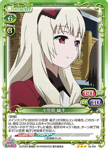| 〔我慢〕メインエリアに自分の「小笠原 綸子」が3枚以上いる場合、このカードは、発生コストが2以上のキャラには妨害されない。このカードがアプローチした場合、相手のキャラ1枚は、ターン終了時まで「小笠原 綸子」を妨害できない。 | ||