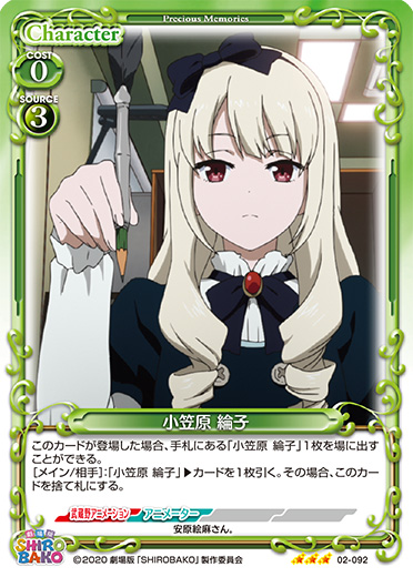 | このカードが登場した場合、手札にある「小笠原 綸子」1枚を場に出すことができる。[メイン/相手]:「小笠原 綸子」▶カードを1枚引く。その場合、このカードを捨て札にする。 | ||