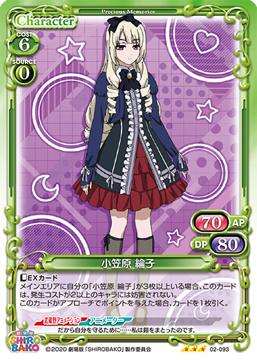 | 〔EXカード〕メインエリアに自分の「小笠原 綸子」が3枚以上いる場合、このカードは、発生コストが2以上のキャラには妨害されない。このカードがアプローチでポイントを与えた場合、カードを1枚引く。 | ||