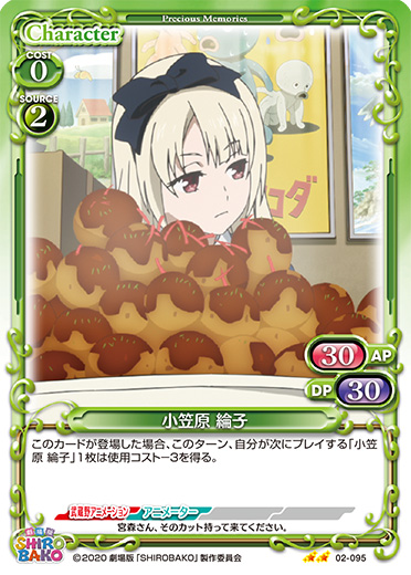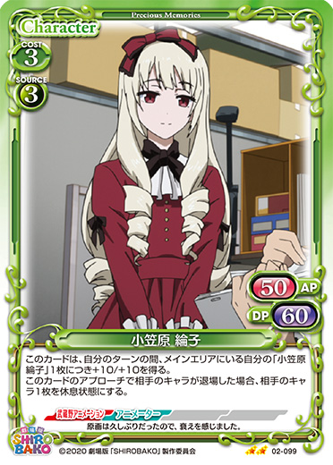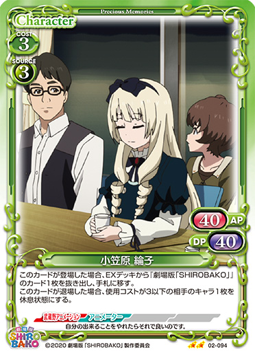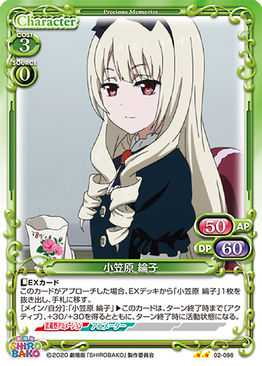 | このカードが登場した場合、このターン、自分が次にプレイする「小笠原 綸子」1枚は使用コスト-3を得る。 | ||