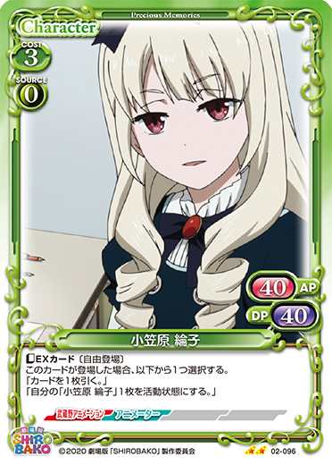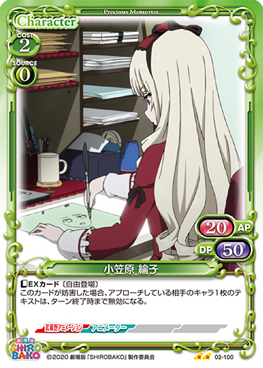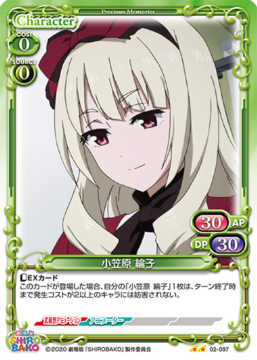 | 〔EXカード〕このカードが登場した場合、自分の「小笠原 綸子」1枚は、ターン終了時まで発生コストが2以上のキャラには妨害されない。 | ||