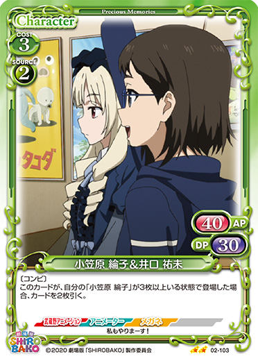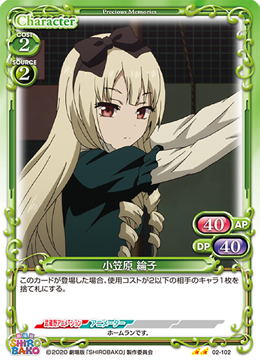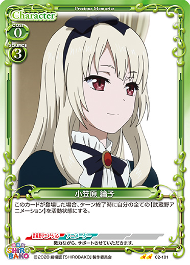 | 〔コンビ〕このカードが、自分の「小笠原 綸子」が3枚以上いる状態で登場した場合、カードを2枚引く。 | ||