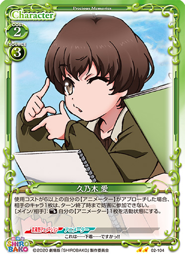 | 使用コストが6以上の自分の【アニメーター】がアプローチした場合、相手のキャラ1枚は、ターン終了時まで妨害に参加できない。[メイン/相手]:《休》自分の【アニメーター】1枚を活動状態にする。 | ||